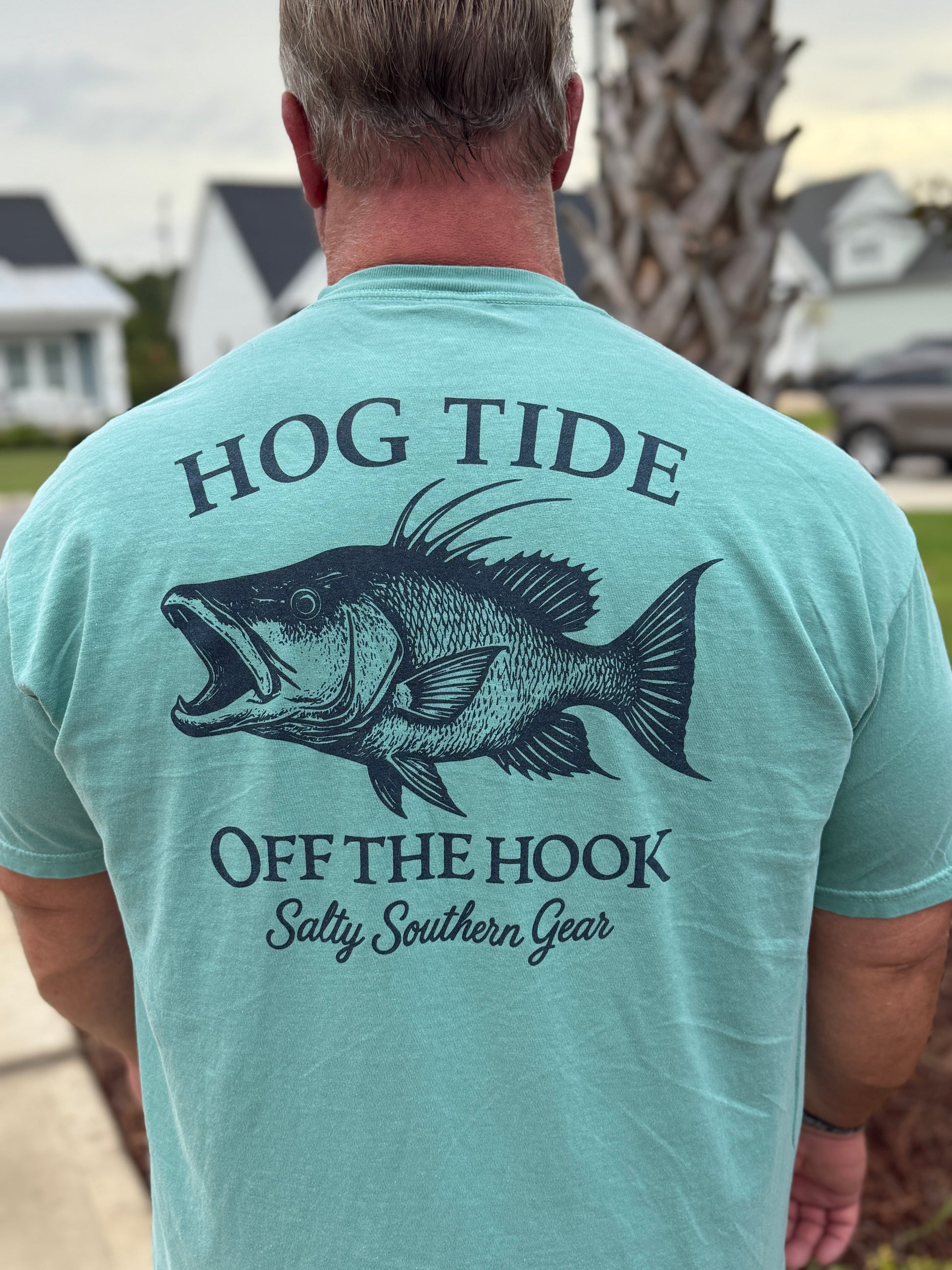 The “Hog Tide” Tshirt is a great depictiction of the unique Hog Fish that is a coastal favorite to catch for its unmistaken look and its delicious taste! The is a pocketed Tshirt that is soft and durable wash after wash.